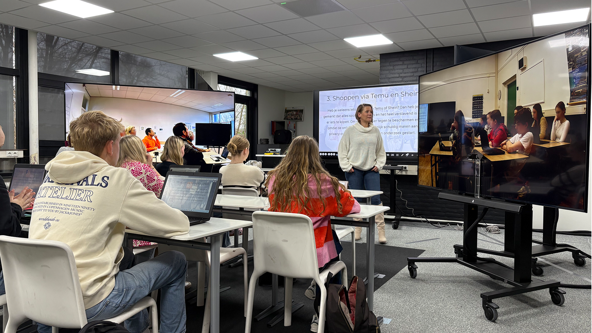 In alle drie de lokalen staan 5 schermen met microfoons en camera’s. De leerlingen en de docenten zijn live met elkaar verbonden. De docent geeft les en door het haarscherpe beeld en perfect geluid, lijkt het op elke locatie of de leerlingen in één ruimte zitten. Ze kunnen elkaar bij wijze van spreken aanraken...