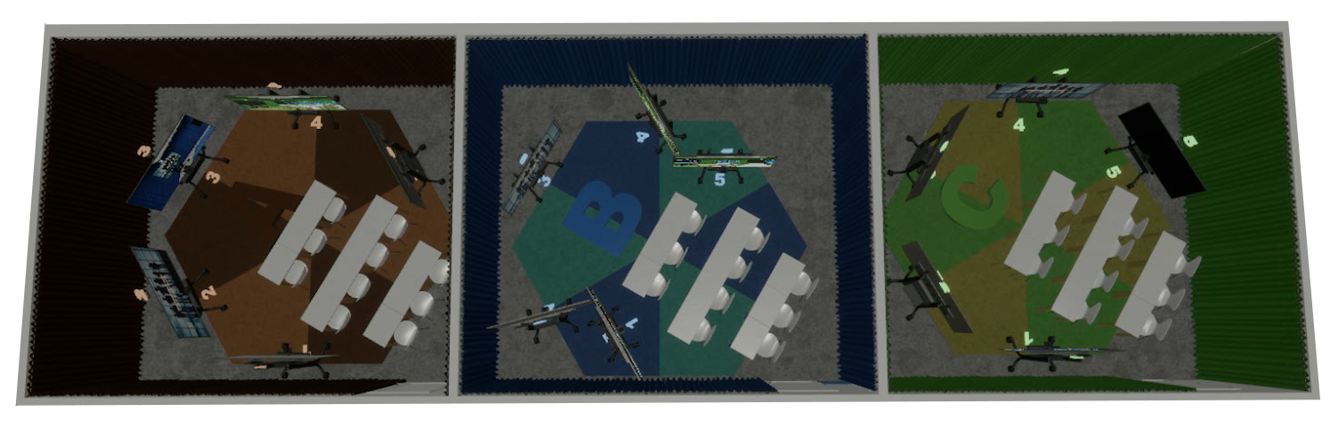Hierboven een voorbeeld van drie verschillende locaties met beeld en geluid van de andere locaties.
