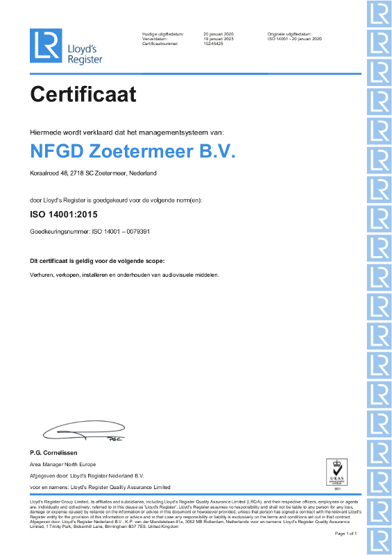 De NFGD is al jaren bezig op het gebied van milieu en duurzame bedrijfsvoering. Ons milieubeleid en footprint waren al belangrijke aspecten om vast te leggen in ons Milieumanagementsysteem. Hierdoor kunnen wij de milieurisico’s binnen ons werkveld en de hele keten, in kaart brengen, beheersen en waar mogelijk uiteraard ook verbeteren. Het certificaat voor ISO 14001-2015 is voor ons de kers op de appelmoes. Wij zijn trots op al onze medewerkers, die volledig achter ons milieubeleid staan en het mede mogelijk hebben gemaakt dat wij dit certificaat hebben behaald.